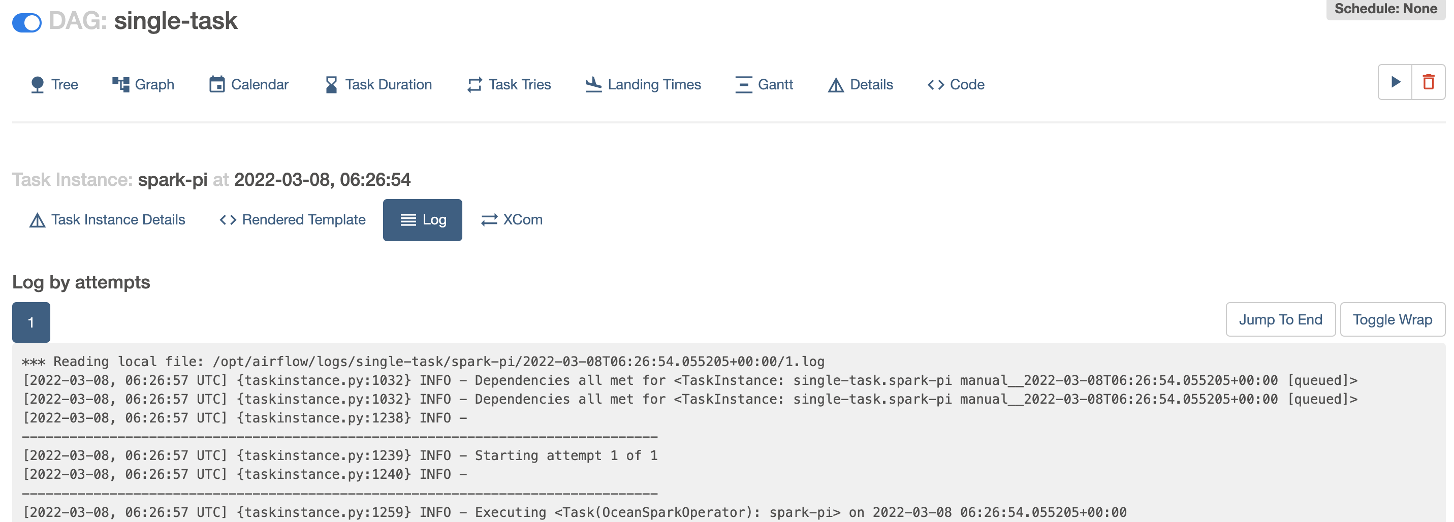 The example file below defines an Airflow DAG with a single task that runs the canonical Spark Pi on Ocean for Apache Spark.