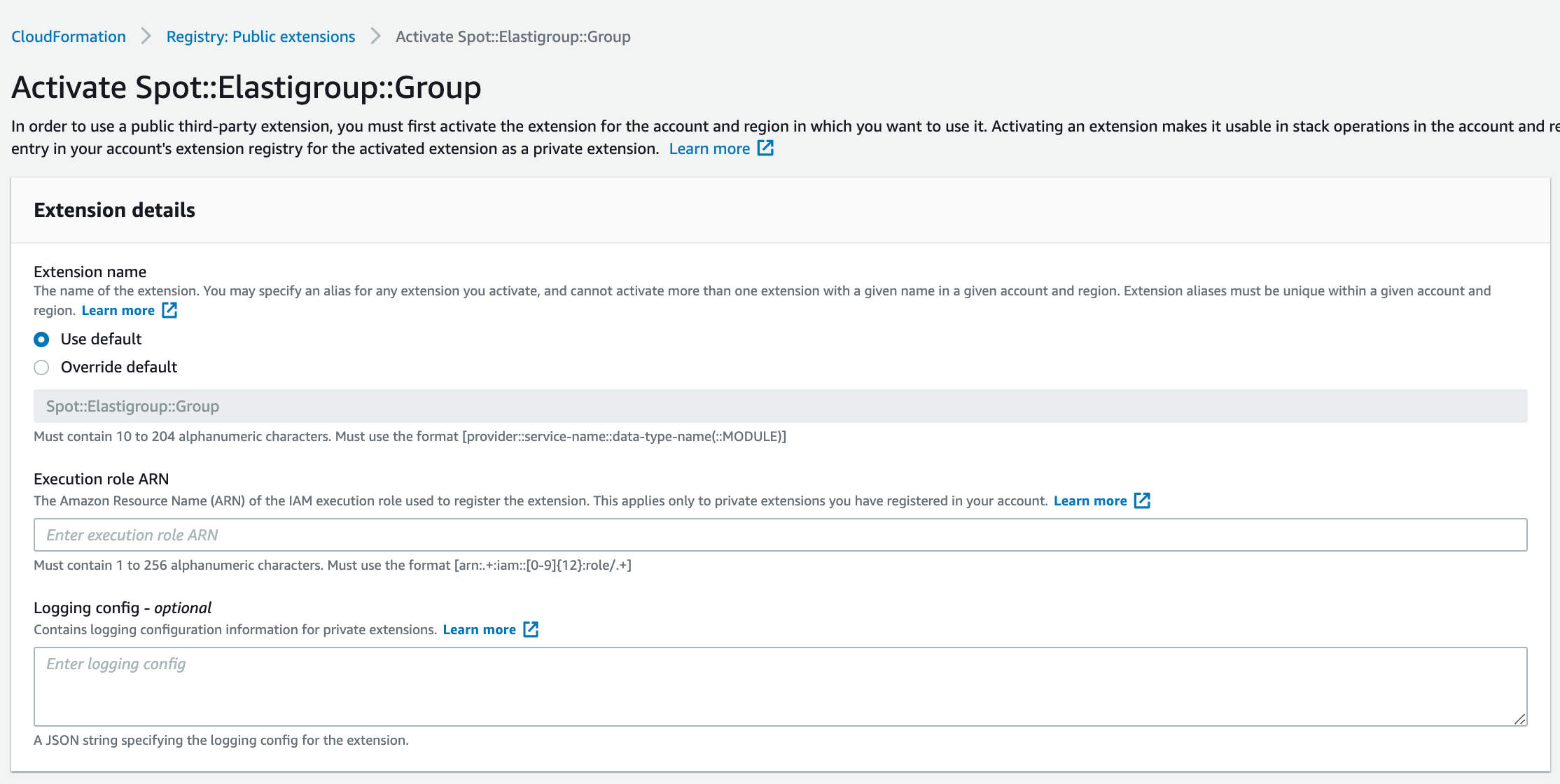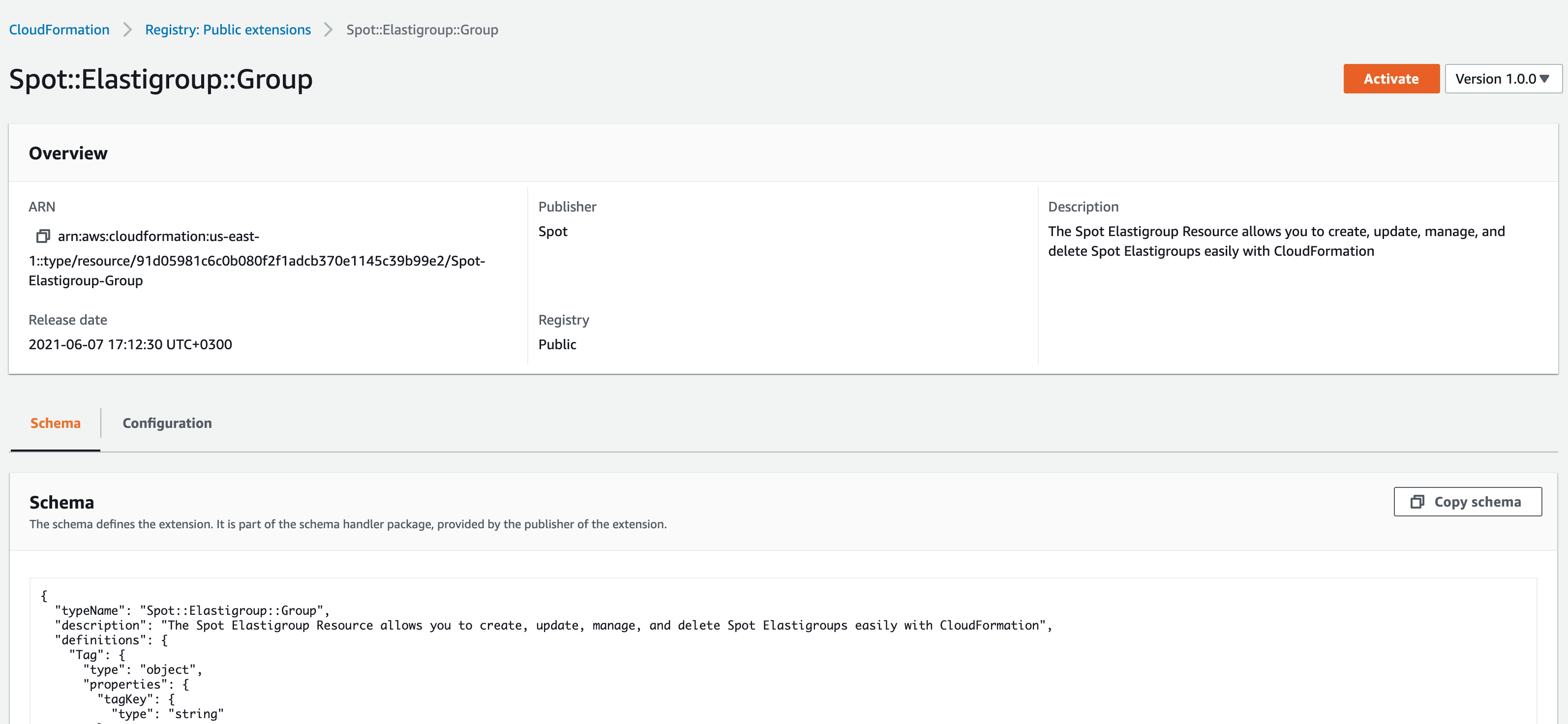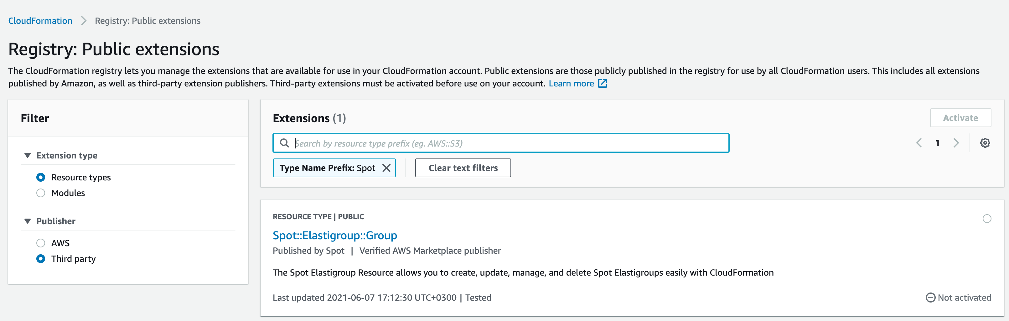 This page describes how to activate a Spot resource in the AWS CloudFormation public extension registry.